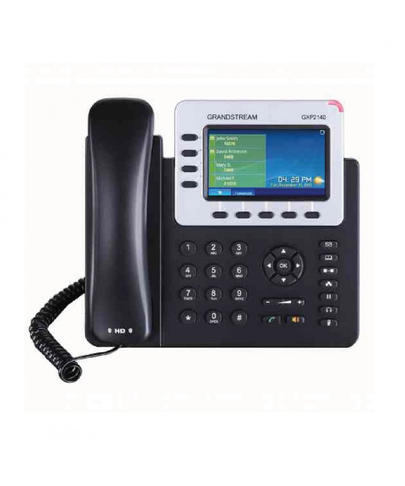 El GXP2140 es un avanzado teléfono IP de categoría empresarial con hasta 4 líneas, TFT LCD color de 4.3”, 5 teclas XML programables sensibles al contexto, doble puerto de red Gigabit, PoE y Bluetooth integrados, conferencia de voz de 5 vías y Electronic Hook Switch (EHS). El GXP2140 ofrece calidad de audio superior en el auricular y el altavoz, recursos telefónicos valiosos y de última generación, información personalizada y servicio de aplicación personalizable, aprovisionamiento automático para fácil instalación, protección de seguridad avanzada para mayor privacidad e interoperabilidad amplia con la mayoría de los dispositivos SIP de terceros y las principales plataformas SIP/NGN/IMS. El GXP2140 es compatible con el Módulo de Extensión GXP2200, lo que permite el acceso rápido y sencillo a hasta 160 contactos con un simple toque. Ideal para pequeñas y medianas empresas, el GXP2140 es la elección perfecta para usuarios que buscan un teléfono IP ejecutivo multilínea de alta calidad y rico en recursos, con funcionalidad y desempeño avanzados.