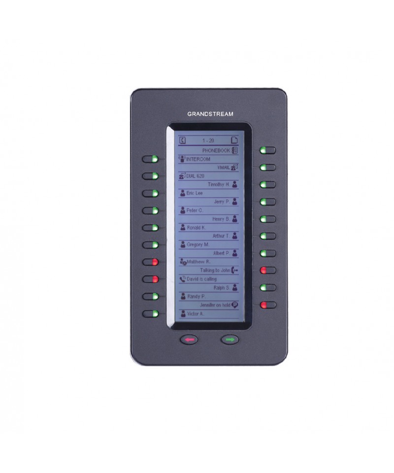 El módulo GXP2200EXT ofrece funcionalidad, versatilidad y flexibilidad adicionales a los teléfonos IP Empresarial GXP2140 y GXP2170 y al Videoteléfono IP GXV3240 con Android™ de Grandstream. El módulo GXP2200EXT cuenta con una pantalla gráfica LCD de 128 x 384 y 20 botones programables (cada uno con LED bicolor). Permite hasta 40 extensiones por módulo usando las dos teclas de cambio de página y hasta 160 botones cuando los 4 módulos de extensión están conectados en serie. Este módulo de extensión es conectado, activado y controlado por el GXP2140/GXV3240; dando el beneficio de teclas de extensión adicionales al instante. El GXP2200EXT soporta las tradicionales funciones de llamada en cada uno de sus botones programables, incluyendo BLA/SCA (aparencia de línea compartida), BLF (luz de indicador de ocupado de ocupado, estándar o lista de eventos), Estacionamiento/Recuperación de Llamadas, Marcación Rápida, Presencia, Intercom y conferencia/ transferencia/reenvío. El GXP2200EXT es la solución ideal para cualquier recepcionista o negocio que maneje un alto volumen de llamadas. Cuando se usa el GXP2200EXT el asistente telefónico puede garantizar máxima productividad monitoreando y enviando múltiples llamadas entrantes de manera eficiente.